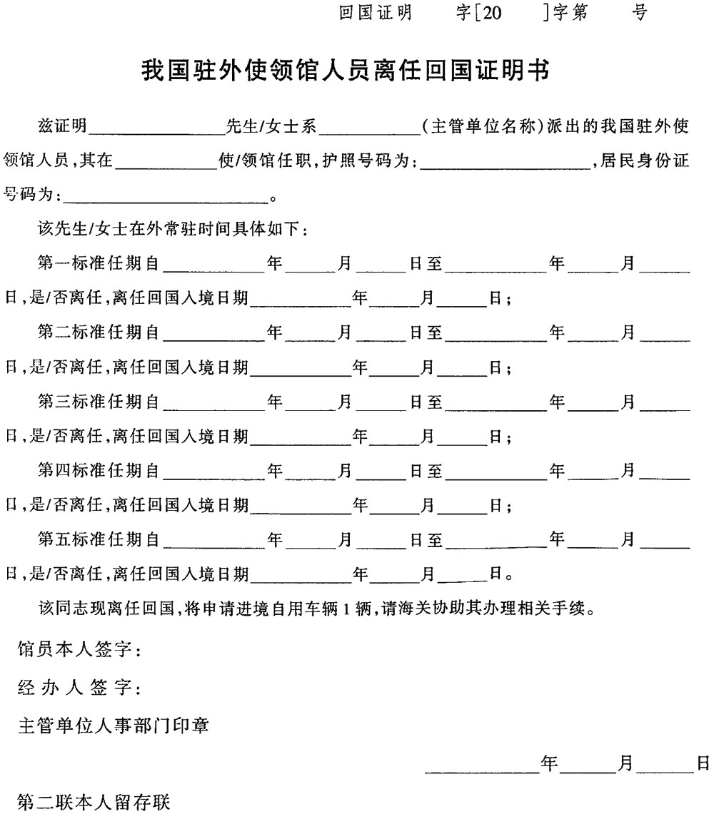 一、对于通知下发前已离任回国的使领馆馆员办理车购税申报纳税时,除按照《通知》规定提供有关资料外,还应分别按下列情况提供身份证明资料: