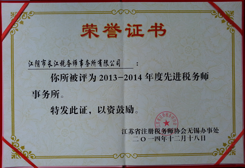 两年一度的无锡先进税务师事务所评选活动传来捷报,江阴市长江税务师事务所再次被江苏省注册税务师协会无锡办事处授予“2013—2014年度先进税务师事务所”的荣誉称号。另外我所的钱惠同志也在众多的注册税务师中脱颖而出,被评为“无锡市优秀注册税务师”。荣誉的获得,不仅证明了我所在税务服务中取得的丰硕成果,而且还体现了我所在注册税务师行业建设方面获得了显著成效,同时也激励我所全体员工在以后的工作中要不断提高管理水平和执业质量,更好地服务于广大企业。