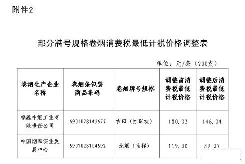1. 部分牌号规格卷烟消费税最低计税价格调整表