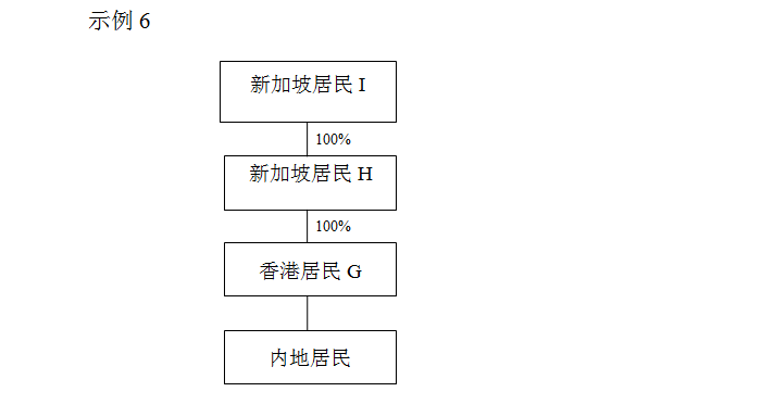示例6投资架构,为本条第一款第(二)项规定的情形,香港居民G投资内地居民并取得股息,新加坡居民I通过新加坡居民H间接持有香港居民G100%的股份,虽然香港居民G不符合“受益所有人”条件,但是,如果新加坡居民I符合“受益所有人”条件,并且新加坡居民I和新加坡居民H从中国取得的所得为股息时,根据中国与新加坡签署的税收协定可享受的税收协定待遇均和香港居民G可享受的税收协定待遇相同,应认为香港居民G具有“受益所有人”身份,香港居民G可根据内地与香港签署的税收安排享受税收协定待遇。