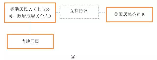 这种构架下,原则来看,香港居民A根据9号公告就可以直接认定为股息的“受益所有人”。但是,如果此时美国居民公司B和香港居民A签订了一个受益权互换协议,即美国居民公司B支付香港A公司一个固定的利息换取其从内地居民取得的股息。如果这种互换协议安排的存在,税务机关在执法中仍然可以去否定香港居民A的“受益所有人身份”身份。所以,“安全港”条款并非100%绝对安全,我们还是要做一些综合考察。
