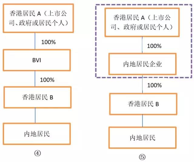 但是,还有一个是9号公告解读中没有画出的图形,就是右边⑤中,因为9号公告说,申请人被第(一)至(三)项中的一人或多人直接或间接持有100%股份,且间接持有股份情形下的中间层为中国居民,香港居民B也可以直接认定为“受益所有人”。为什么这种结构香港居民B可以直接认定股息“受益所有人”呢,估计是这种结构下,香港居民B的股息到内地居民A,再到最上层终极实体中,最终是符合受益所有人条件,且也无避税空间,且一定程度还存在重复征税问题,即这种构架实际受益人穿透到最上层为香港居民,且该构架并无避税意图,因此可以直接认定。