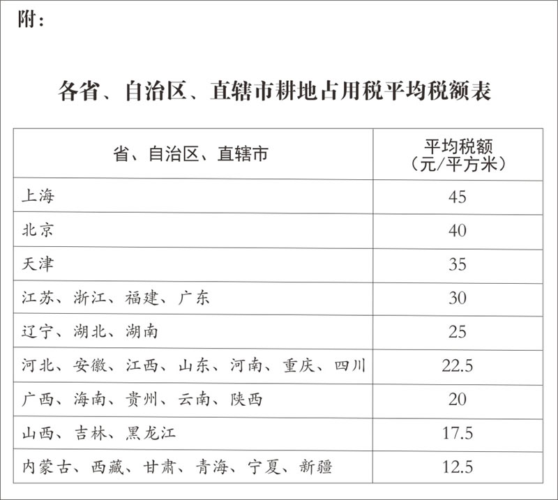 图表:各省、自治区、直辖市耕地占用税平均税额表