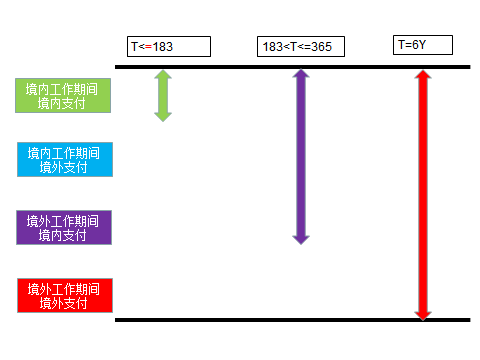 这里要注意,无协定的无住所个人,在一个纳税年度在中国境内居住超过90天,不足183天时,按国内法规则,对照我的四色图,他应该按绿色模块+蓝色模块交税。