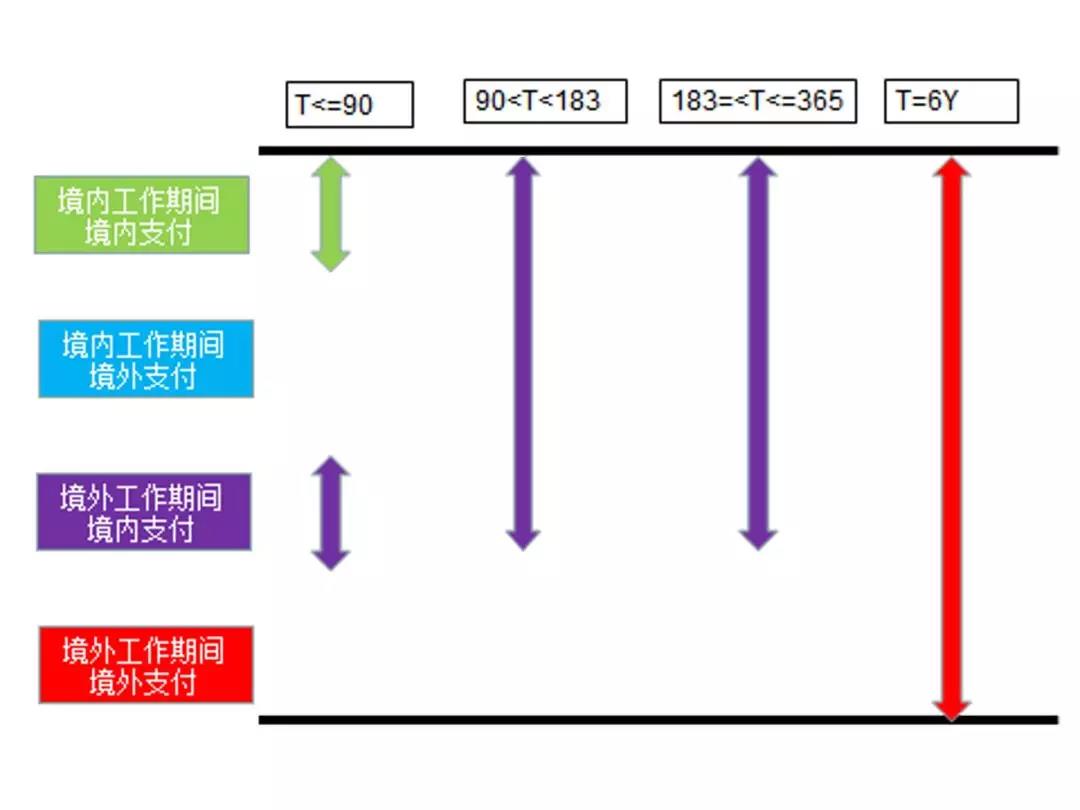 但是,很奇怪的是,为什么35号公告对于高管人员在境内居住时间累计不超过90天的情形只是规定了文字性规定,且没有给出计算公式呢?看我的独创“四色图”你就发现,在不超过90天的情况下,他的纳税义务是绿色+紫色,大家自己就可以看一下: