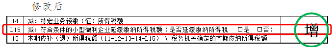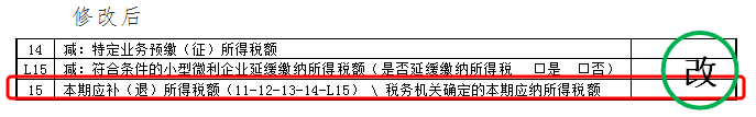 3.原第15行名称修改为“本期应补(退)所得税额(11-12-13-14-L15) \ 税务机关确定的本期应纳所得税额”。