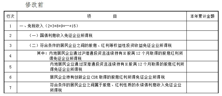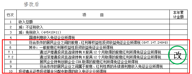 原第6行调整为第7.1行,项目名称修改为“通过沪港通投资且连续持有H股满12个月取得的股息红利所得免征企业所得税”,业务规则不变;