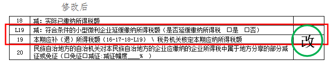原第19行项目名称修改为“本期应补(退)所得税额(16-17-18-L19) \ 税务机关核定本期应纳所得税额”。