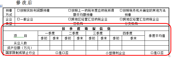 5.为优化填报口径,将《中华人民共和国企业所得税月(季)度预缴纳税申报表(A类)》(A200000)“按季度填报信息”部分前移,并扩充“从业人数”和“资产总额”栏次,列示第一季度至税款所属季度的各季度季初值、季末值、季度平均值,方便纳税人在申报时修正之前季度的错报数据。
