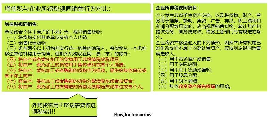 此处注意区别自产货物与外购货物用于集体福利的财税处理。实务中发现小伙伴在视同销售情形容易混淆,总结一下: