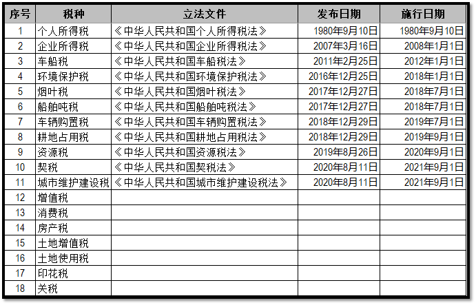 我国现行税种共有18个,截至2020年8月20日,已立法的税种有11个,剩余7个税种尚未完成立法程序,部分还在征求意见中,一般以暂行条例等行政法规发布执行。