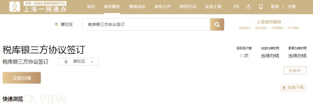 企业登录【上海一网通办】,在【政务服务】中按主题或按部门,选择涉税事项相关内容,或在搜索框中输入“存款账户账号报告”或“税库银三方协议签订”,定位到具体办事指南,点击“立即办理”按钮,以单点登录方式跳转至上海市电子税务局功能节点,无须二次登录,完成存款账户报告及三方协议签订。具体可参考上海市电子税务局操作。