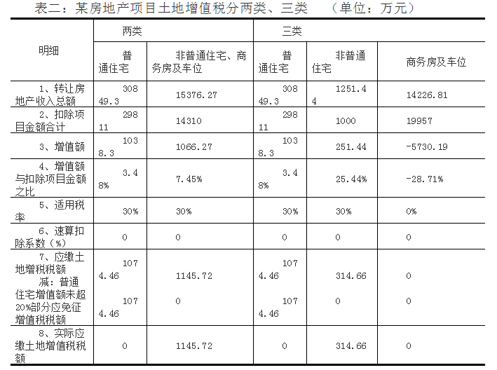 以嘉业房地产企业开发项目开发一期为例(见表一),采用分两类(即普通住宅和其他)对项目进行清算,企业应纳土地增值税1029万元,税负率0.98%(见表二);采用分三类(即普通住宅、非普通住宅和其他)对项目进行清算,应纳土地增值税2343万元,税负率2.28%(见表二),两者计算应缴土地增值税相差较多。若采用四分类,企业税负更重。