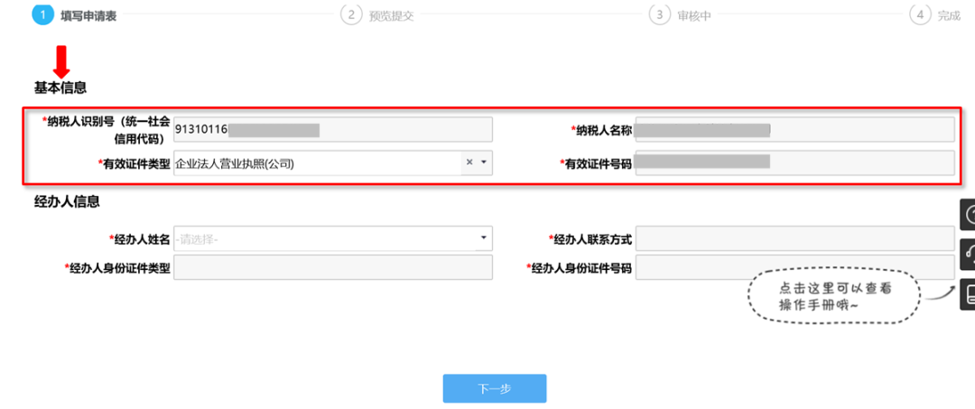 填写申请表:页面自动会带出纳税人基本信息,选择办税员,完成后点击[下一步]