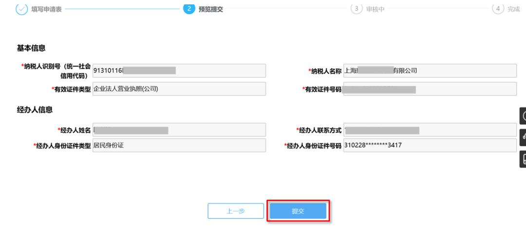 ①核对基本信息和办税人信息无误后,则可点击[提交](若有问题则可点击[上一步]返回修改)