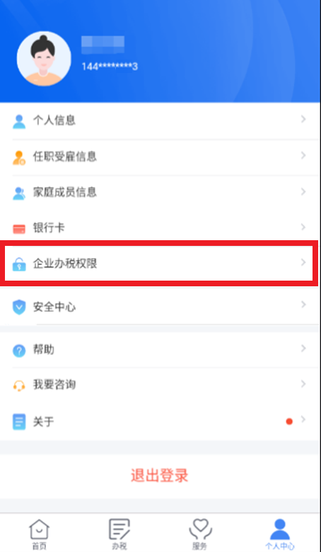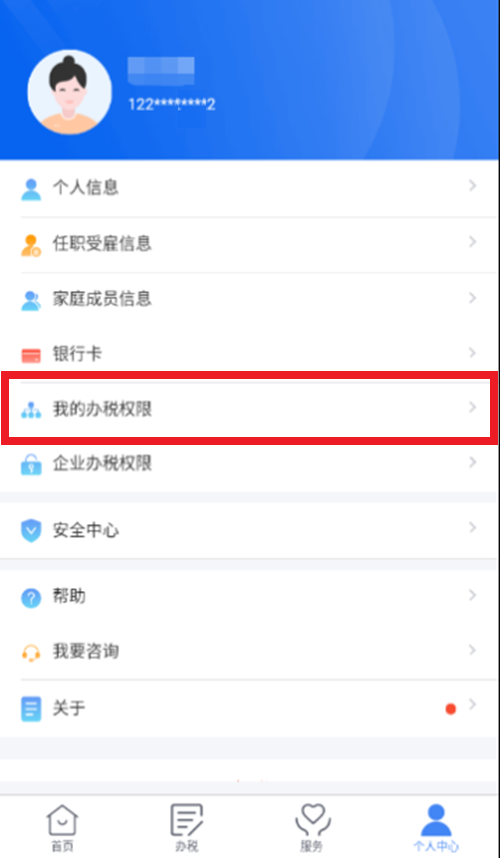 1、企业法人,财务负责人登录平台后,个人中心选择【企业办税权限】。