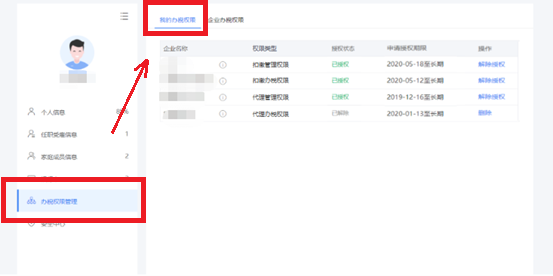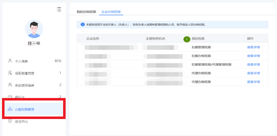 企业法人、财务负责人登录平台后,个人中心页面显示“企业办税权限”。“企业办税权限”自动展示当前任职受雇单位列表,可进行授权管理。