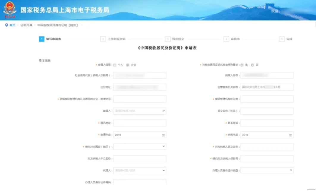 填写《中国税收居民身份证明》申请表: