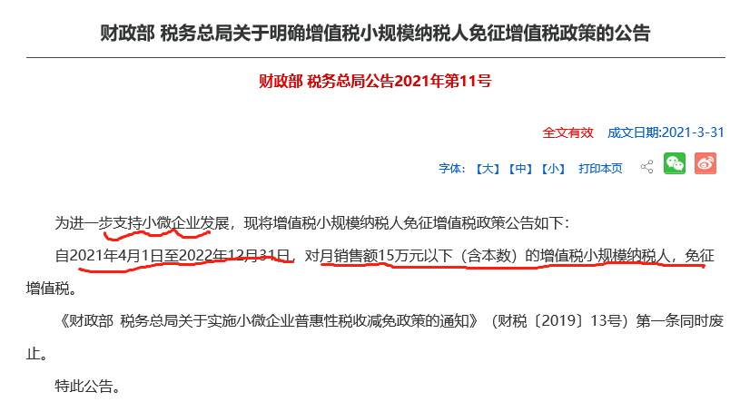 政策依据:财政部 税务总局公告2021年第11号,为进一步支持小微企业发展,现将增值税小规模纳税人免征增值税政策公告如下:自2021年4月1日至2022年12月31日,对月销售额15万元以下(含本数)的增值税小规模纳税人,免征增值税。