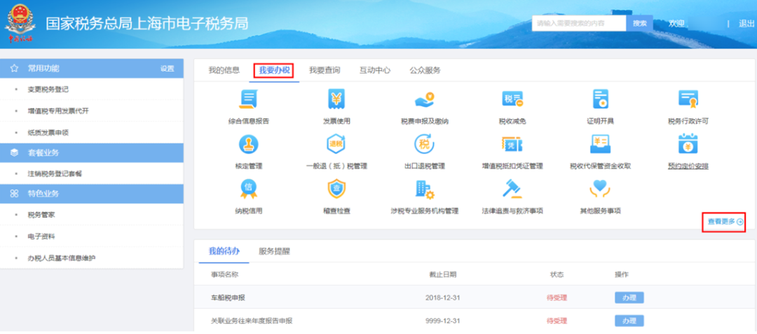 登录电子税务局,点击【我要办税】,点击【查看更多】