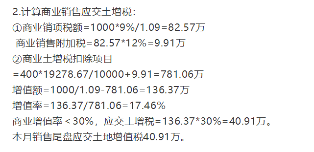最后,计算尾房销售收入的土地增值税:该房地产企业应缴纳土地增值税为412.5×30%=123.825万元。