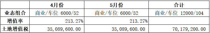 第三组:在4、5月份分别销售商业6000平方,分别销售车位70个和34个,土地增值税计算情况如下: