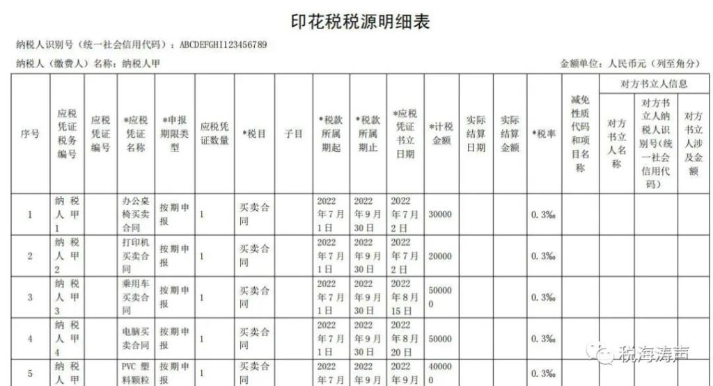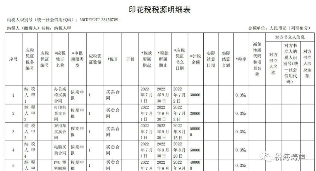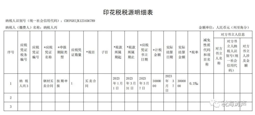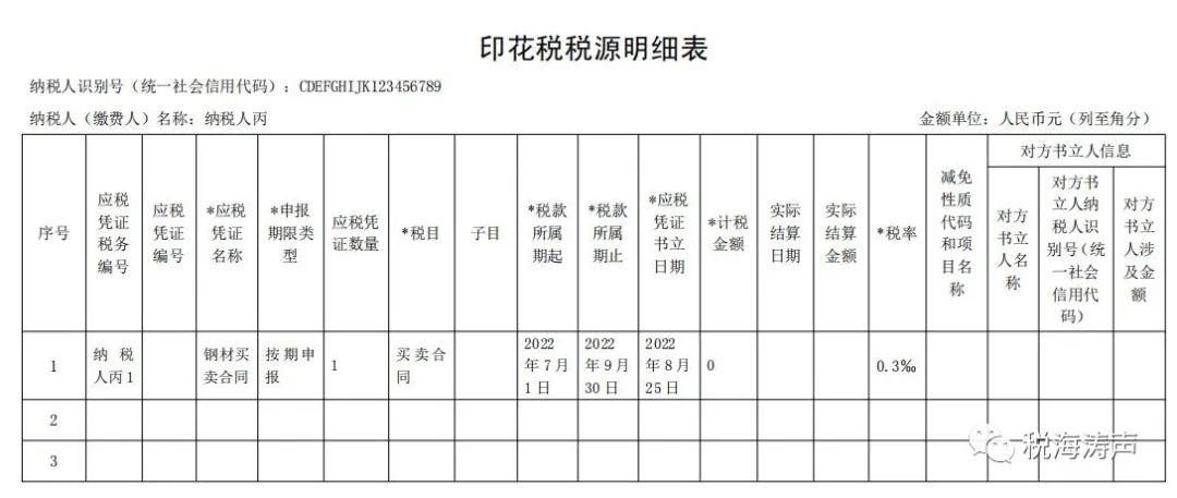 举例说明3:纳税人丙按季申报缴纳印花税,2022年8月25日书立钢材买卖合同1份,合同列明了买卖钢材数量,并约定在实际交付钢材时,以交付当日市场报价确定成交价据以结算,2022年10月12日按合同结算买卖钢材价款100万元,2023年3月7日按合同结算买卖钢材价款300万元。该纳税人应在书立应税合同以及实际结算时,填写《印花税税源明细表》,分别在2022年10月、2023年1月、2023年4月纳税申报期,进行财产行为税综合申报,具体如下:
