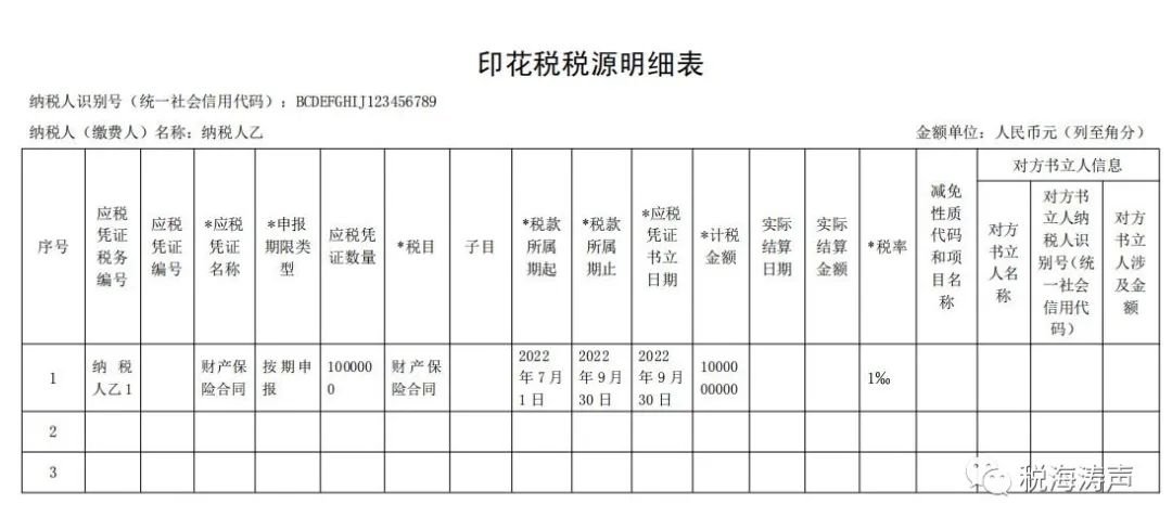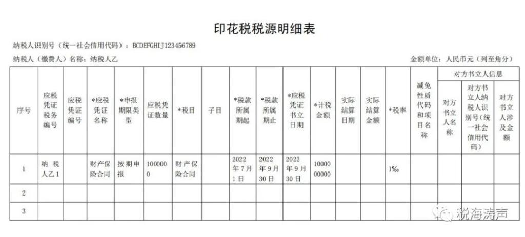 举例说明2:纳税人乙按季申报缴纳印花税,2022年第三季度书立财产保险合同100万份,合同所列保险费(不包括列明的增值税税款)共计100000万元。该纳税人应在书立应税合同时,填写《印花税税源明细表》,在2022年10月纳税申报期,进行财产行为税综合申报,具体如下: