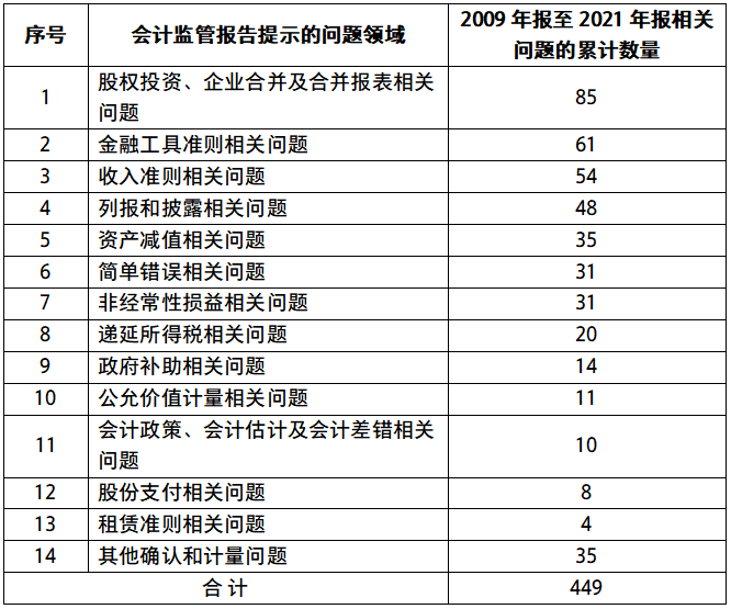 回顾证监会发布的上市公司2009年报至2021年报会计监管报告内容,部分上市公司对准则理解和执行不到位的问题涉及领域比较集中,其中,长期股权投资、企业合并及合并报表相关问题涉及最多,其次是金融工具和收入准则相关等问题,2009年报至2021年报相关问题涉及数量汇总如下(按照集中度排序):