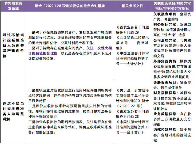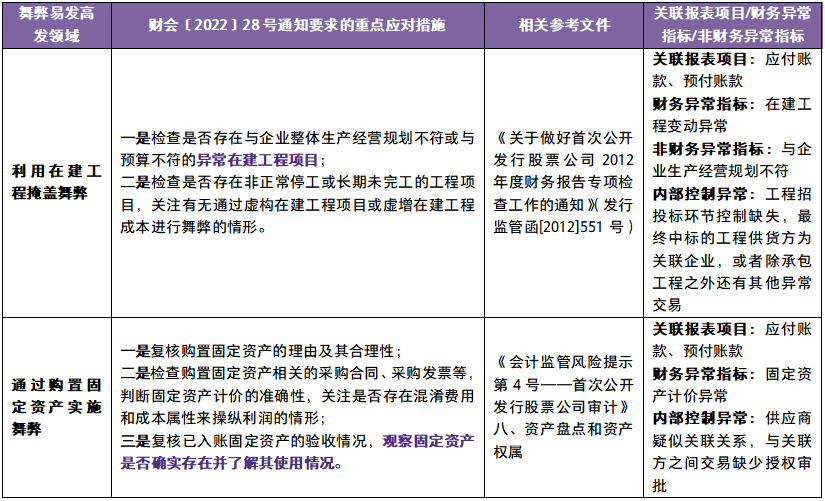 财会〔2022〕28号通知附件列举了货币资金、存货、在建工程和购置资产、资产减值、收入、境外业务、企业合并、商誉、金融工具、滥用会计政策和会计估计、关联方关系及交易等11个财务舞弊易发高发领域及重点应对措施。致同结合实务中的案例,将舞弊高发领域对应的常见舞弊迹象和审计程序注意事项整理如下: