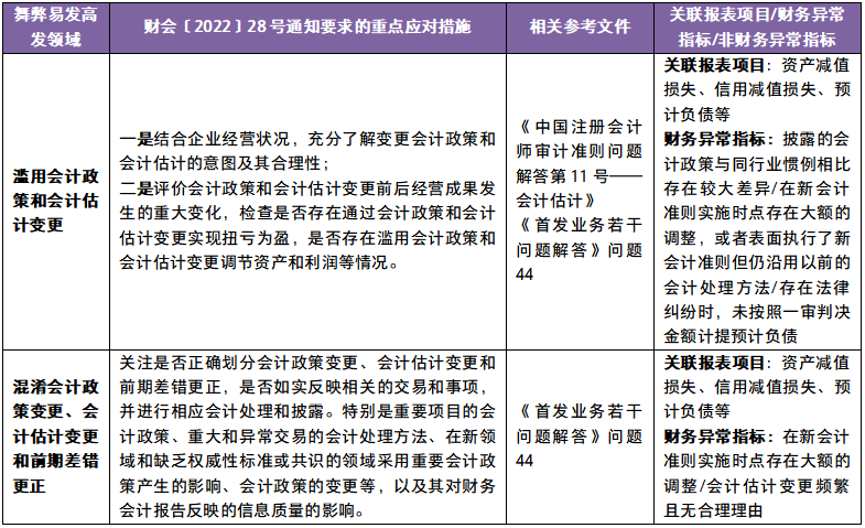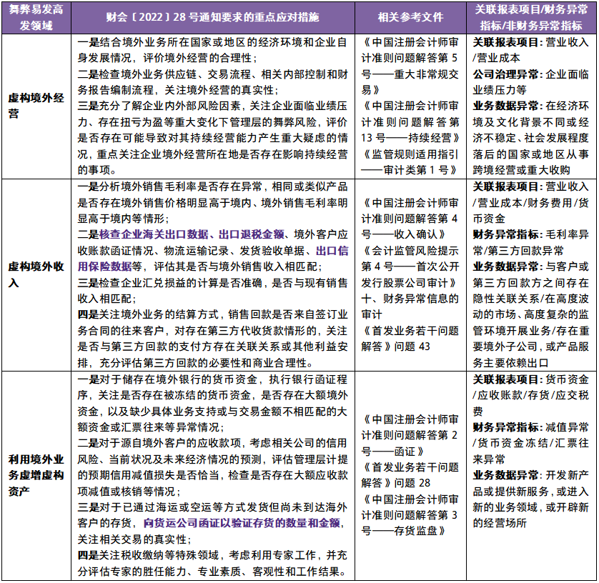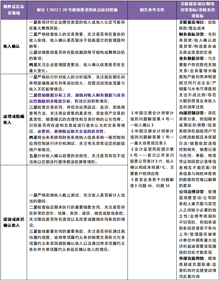 2022年10月12日,财政部发布了《关于加大审计重点领域关注力度 控制审计风险进一步有效识别财务舞弊的通知》(财会〔2022〕28号),旨在贯彻落实《国务院办公厅关于进一步规范财务审计秩序 促进注册会计师行业健康发展的意见》(国办发〔2021〕30号),指导会计师事务所和注册会计师提高应对财务舞弊的执业能力,充分发挥审计鉴证作用。