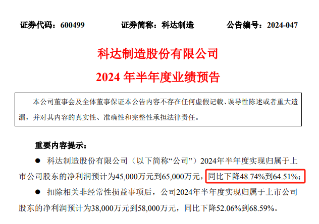 科达制造也发布了今年上半年业绩预告,预计将实现净利润4.5亿元~6.5亿元,同比下降48.74%~64.51%。