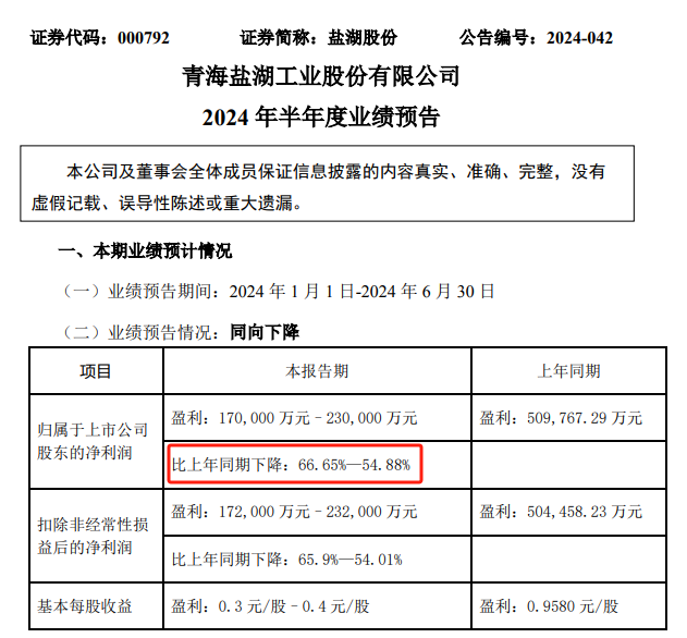 发布业绩预告,2024年上半年,该上市公司净利润或为17亿元~23亿元,将同比大幅下降66.65%至54.88%。