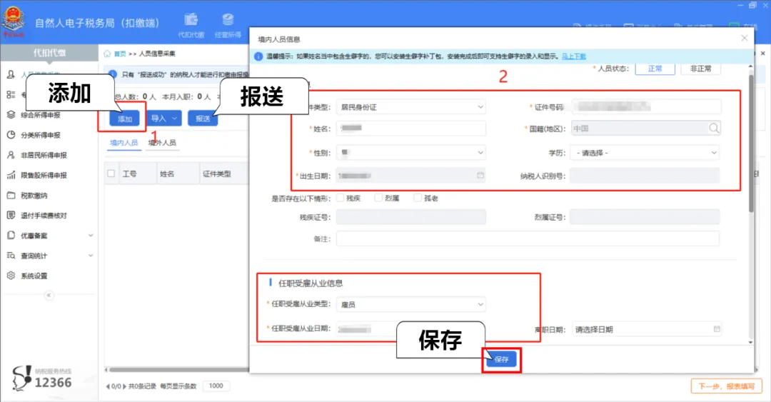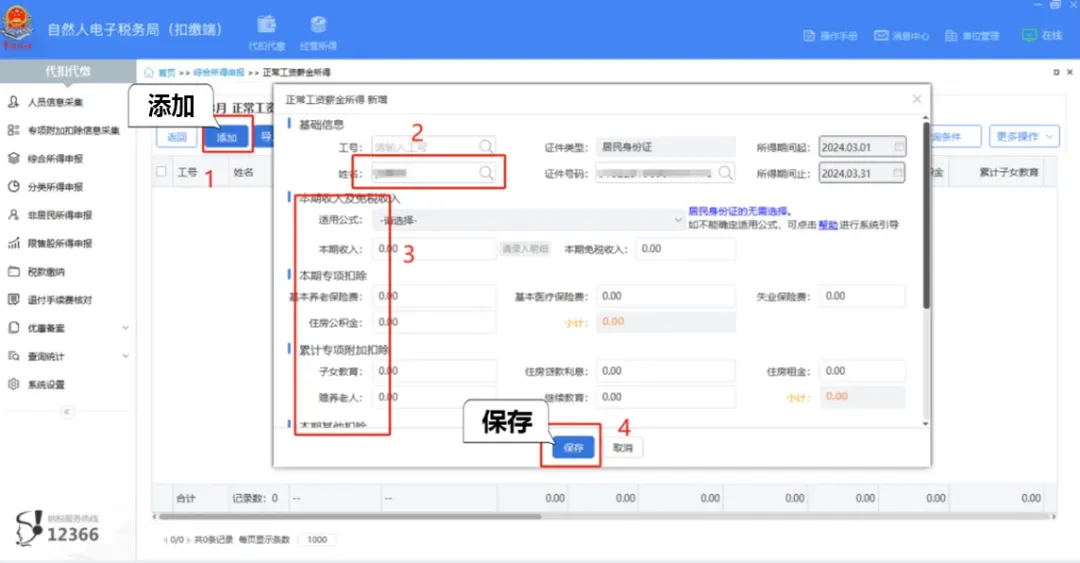 (2)点击【添加】,选择对应的人员,录入本期收入、专项附加扣除等信息,点击【保存】。