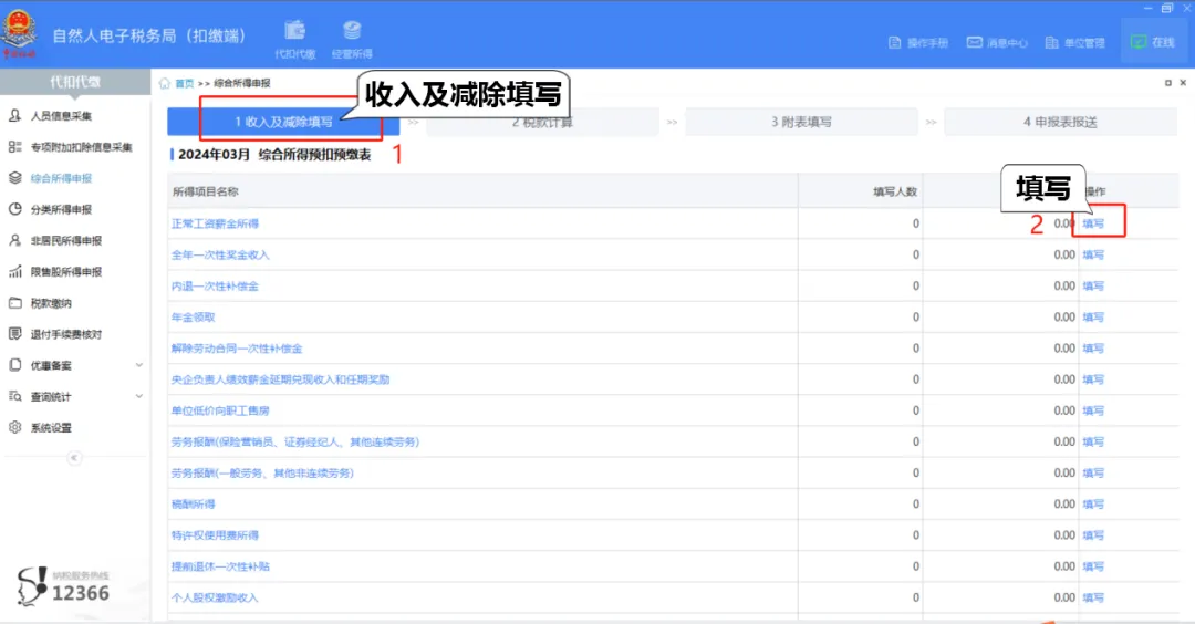 3.进行综合所得申报。点击左侧菜单栏【综合所得申报】,根据主流程导航栏步骤,依次完成综合所得预扣预缴申报。