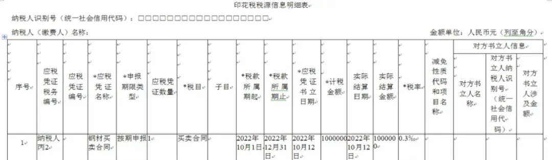纳税人丙按季申报缴纳印花税,2022年8月25日书立钢材买卖合同1份,合同列明了买卖钢材数量,并约定在实际交付钢材时,以交付当日市场报价确定成交价据以结算,2022年10月12日按合同结算买卖钢材价款100万元,2023年3月7日按合同结算买卖钢材价款300万元。该纳税人应在书立应税合同以及实际结算时,填写《印花税税源明细表》,分别在2022年10月、2023年1月、2023年4月纳税申报期,进行财产行为税综合申报,具体如下: