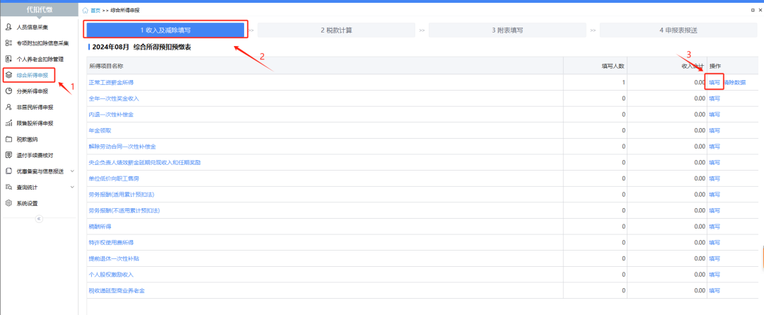 四.更正个人所得税工资薪金,依次点击“综合所得申报”—“收入及减除填写”—“填写”。