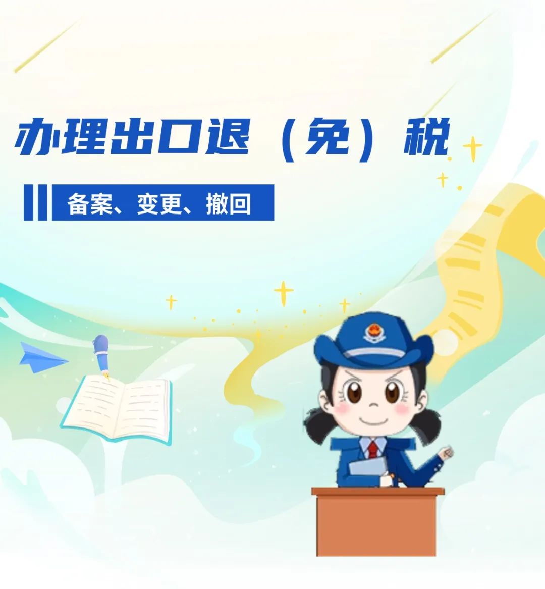 按照党中央、国务院关于推动外贸外资平稳发展、扩大高水平对外开放的工作部署,税务部门会同有关部门出台了一系列出口退(免)税政策规定和征管服务便利化举措,为外贸外资发展营造了良好的税收环境。为帮助企业深入准确理解出口退(免)税政策规定,熟练掌握出口退(免)税业务办理操作流程,更好地适应行业发展新形势,江苏税务推出“出口企业新电子税局无忧办”专题。今天带你了解:如何办理出口退(免)税备案、变更、撤回业务。