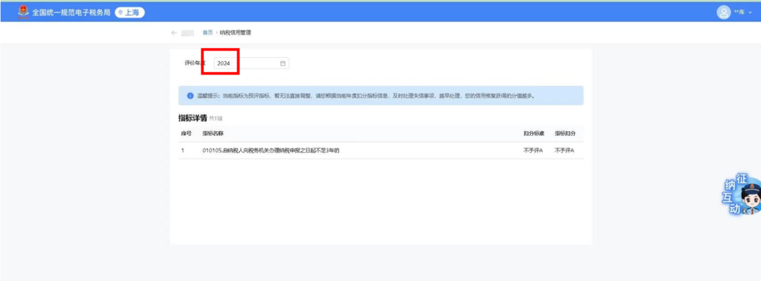 点击进入后,将展示当前年度纳税信用评价情况。