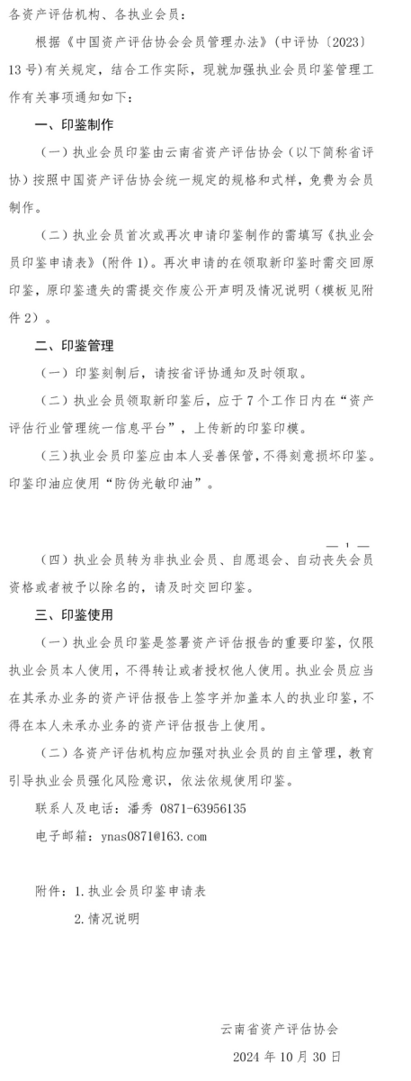 云南省资产评估协会关于加强执业会员印鉴管理工作的通知