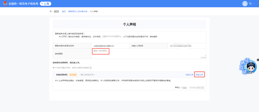 1)跳转个人声明界面,输入原因。点击【上传】上传其他证明资料。