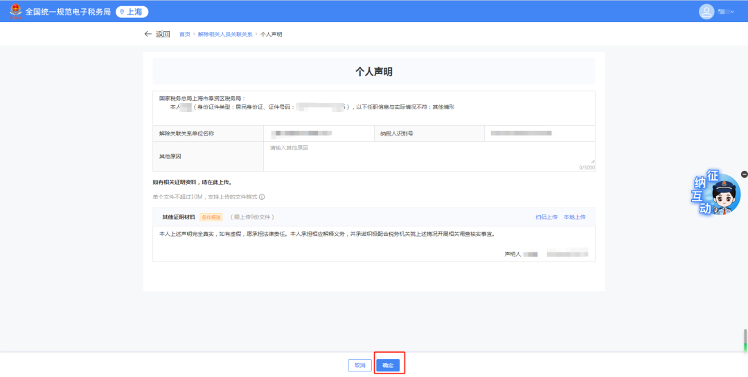 1)跳转个人声明界面,选择【离职时间】,点击【上传】上传对应资料。