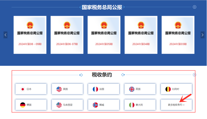 第二步:下拉滚动条,页面下方出现“税收条约”专栏,若您未在页面上找到要寻找的对应国家协定,请点击“更多税收条约”。