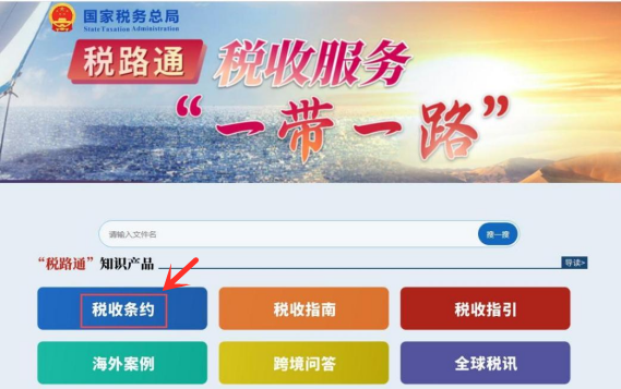 您也可以点击国家税务总局网站首页下方【税路通:税收服务“一带一路”】栏目,进入后点击“税收条约”。