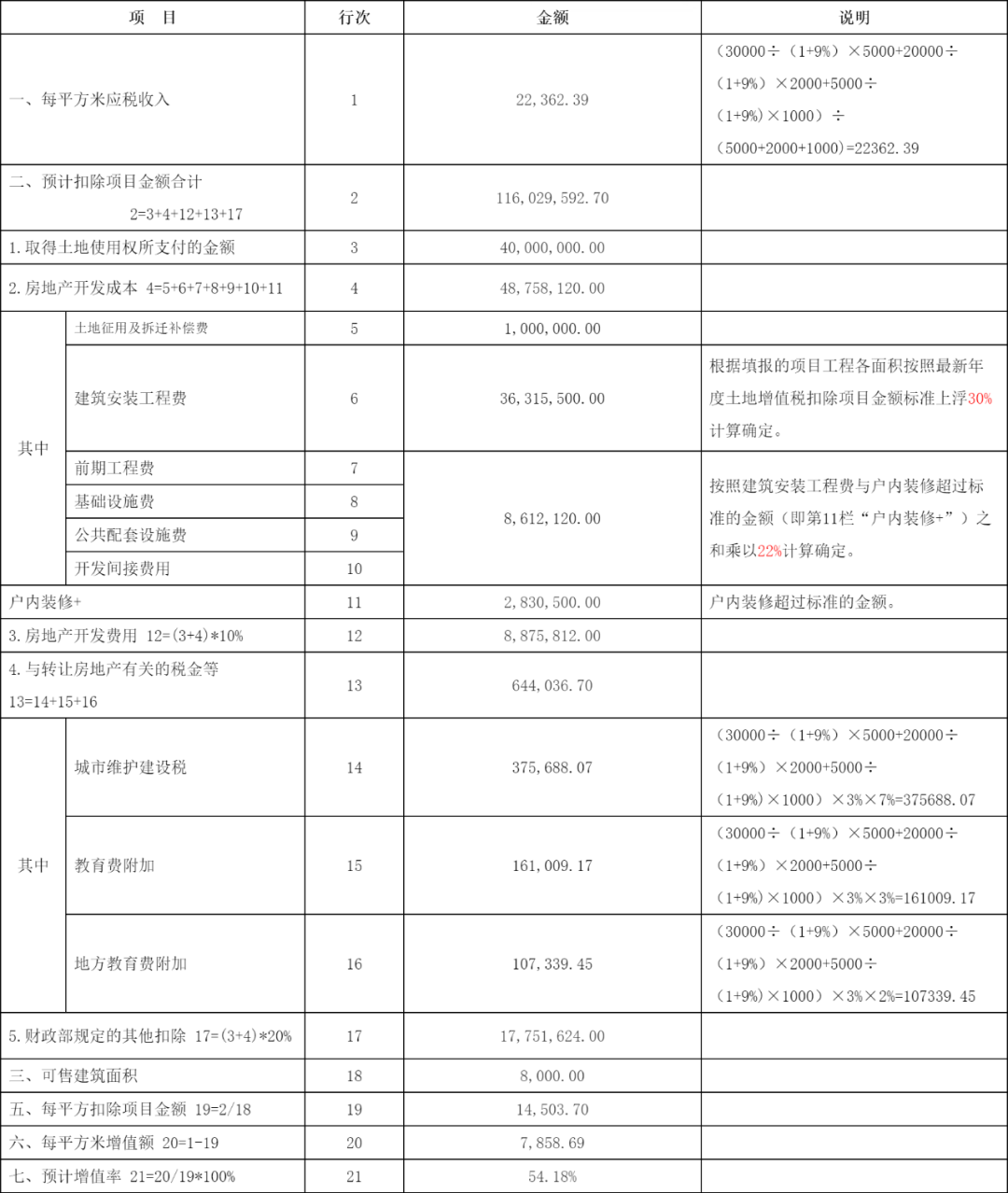 《公告》根据《中华人民共和国土地增值税暂行条例》有关收入和扣除项目的规定,明确了预计增值率的测算方法和测算表格。考虑扣除项目金额标准发布时间滞后2—3年的因素,《公告》规定测算预计增值率时,建筑安装工程费按照我市发布的最新年度土地增值税扣除项目金额标准上浮30%计算确定。另外,结合我市已清算土地增值税项目的成本费用情况,前期工程费、基础设施费、公共配套设施费和开发间接费用,根据计算确定的建筑安装工程费的22%计算确定。现举例说明测算过程: