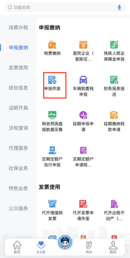登录电子税务局App,点击【办&查】 -【申报缴纳】- 【申报作废】功能菜单。