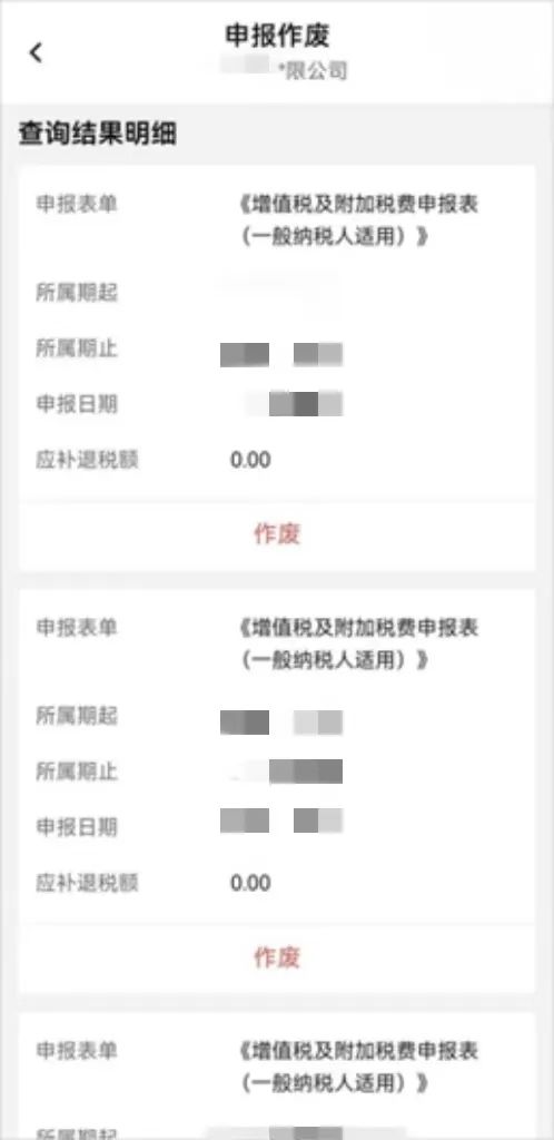 纳税人从查询结果明细列表中,可点击【作废】完成对应申报表单的相关操作。
