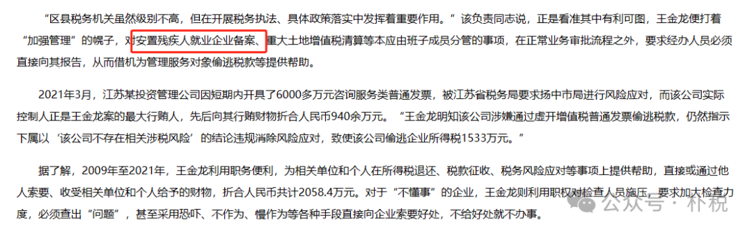 上图是中纪委官网披露的扬中市税务局局长王金龙关于残疾人就业享受税收优惠政策的宣传材料。朴税郑重提醒,不能打着残疾人就业的旗号违法享受税收优惠政策,否则依据新的税收司法解释,可能会被界定为逃税罪!