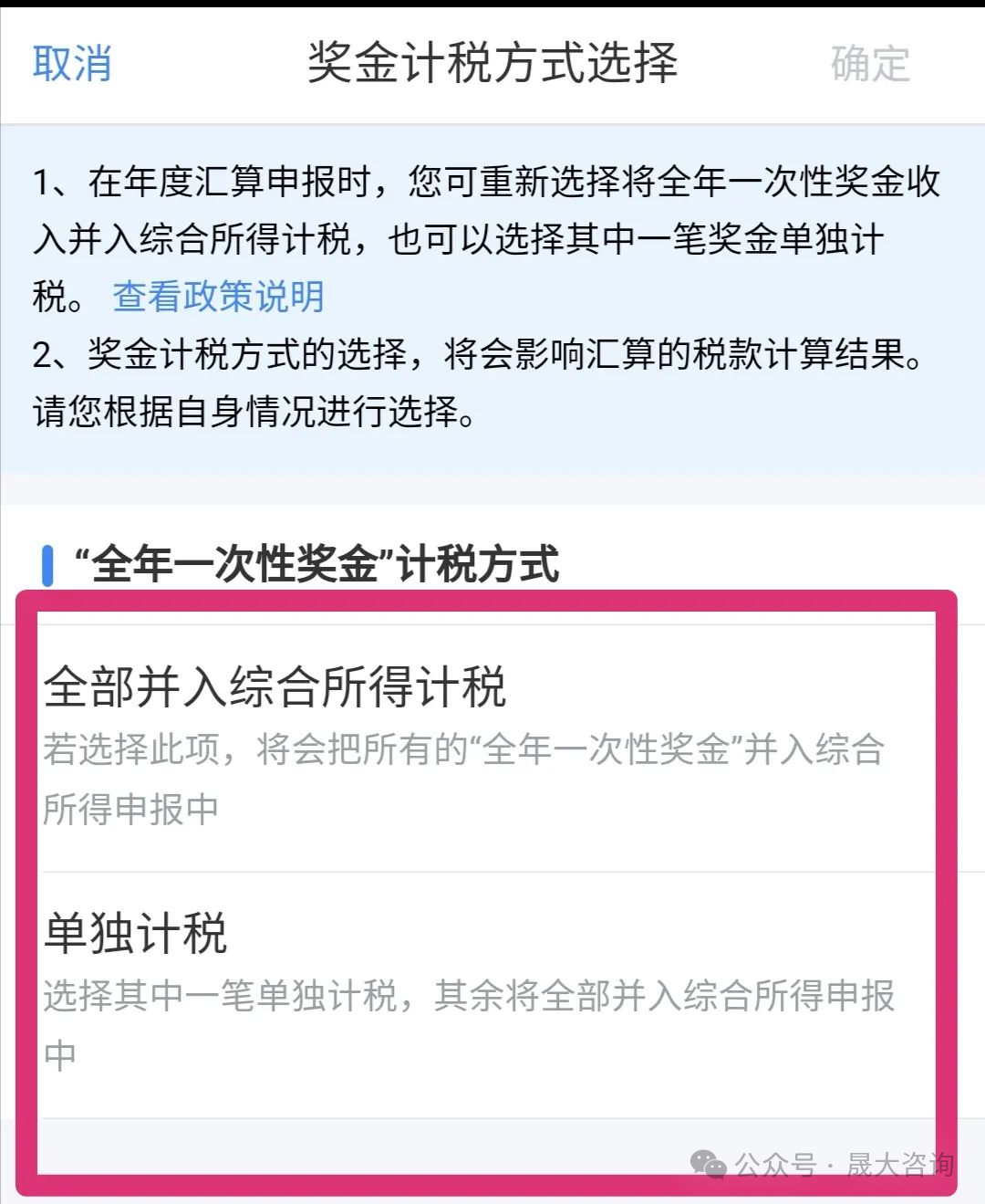 提醒:对存在一笔或多笔全年一次性奖金的纳税人,您在办理年度汇算时,个人所得税APP和自然人电子税务局网页端(https://etax.chinatax.gov.cn)会给予“存在奖金,请在详情中进行确认”的提示,纳税人可以在“奖金计税方式选择”的功能中,选择“全部并入综合所得计税”或者“单独计税”。您可以自行决定哪一笔奖金单独计税并进行调整。当然,您也可以将全部奖金并入综合所得计税。