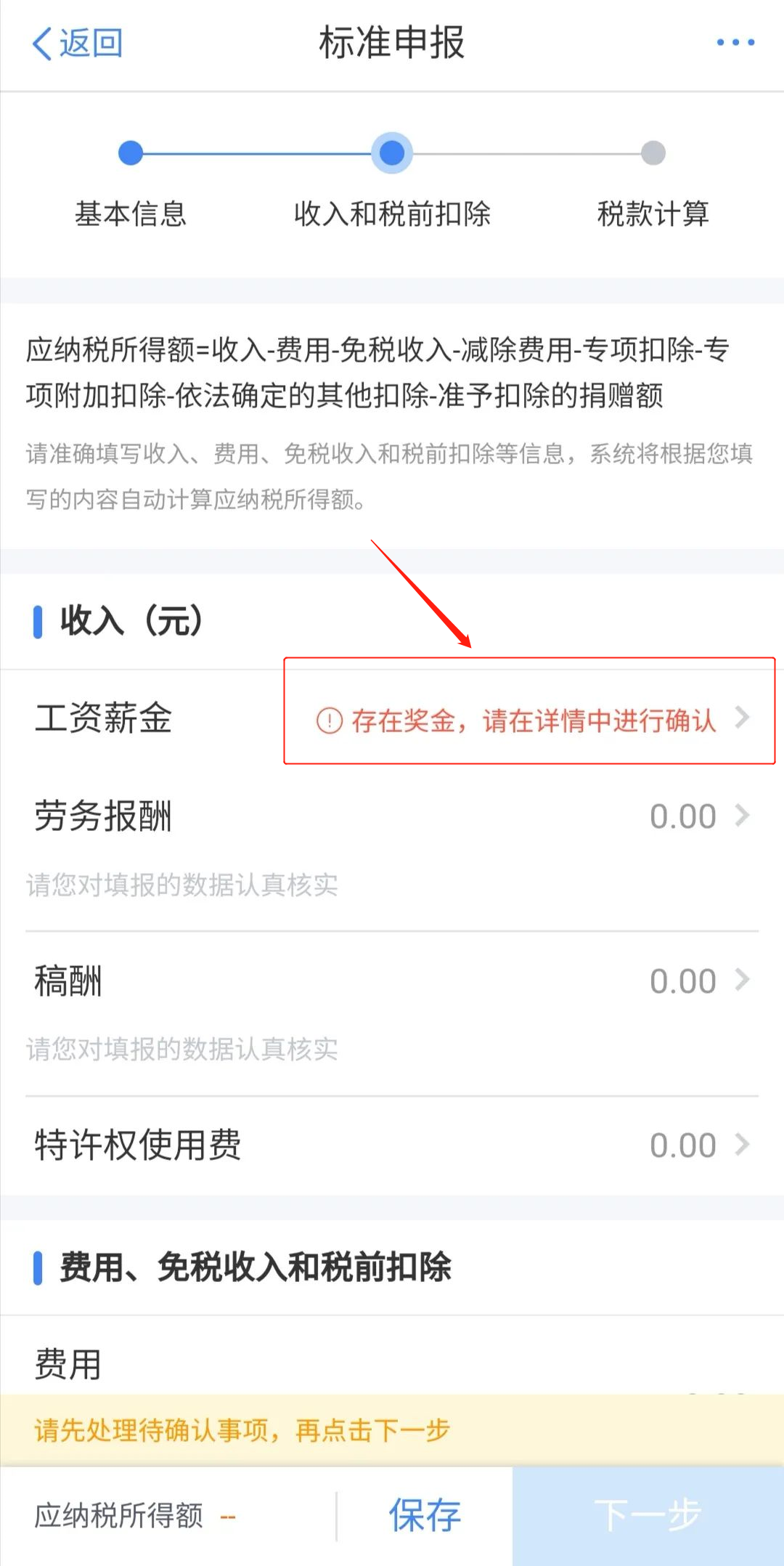 (三)点击【存在奖金,请在详情中进行确认】的红字提示,进入【奖金计税方式选择界面】;